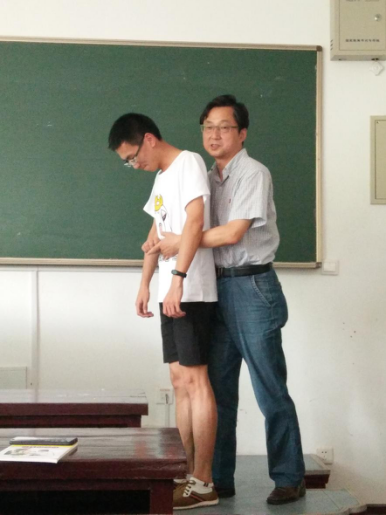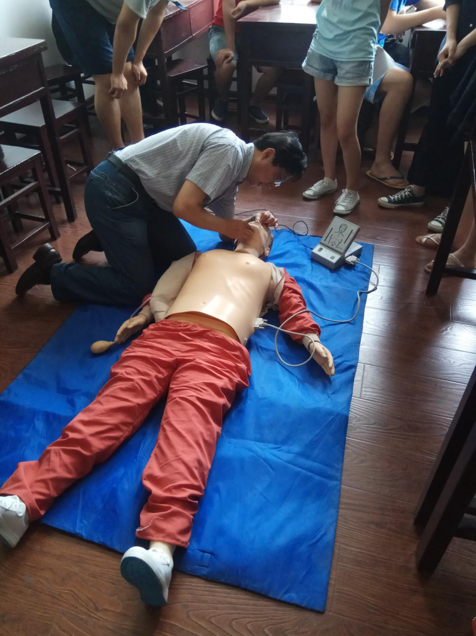 急救培训于下午两点半准时开始,首先,马院长讲授了先复苏后固定、先止血后包扎、先重后轻、现救后送、急救与呼救并重、搬运与医护一致、救人先救己的一系列急救技巧。接着向我们介绍了烧伤、溺水、触电、中暑、煤气中毒、乙醇中毒等生活中较可能遇到的现场救护知识。着重介绍了气道梗阻的救护方法,利用海氏手法进行有效自救和互救。