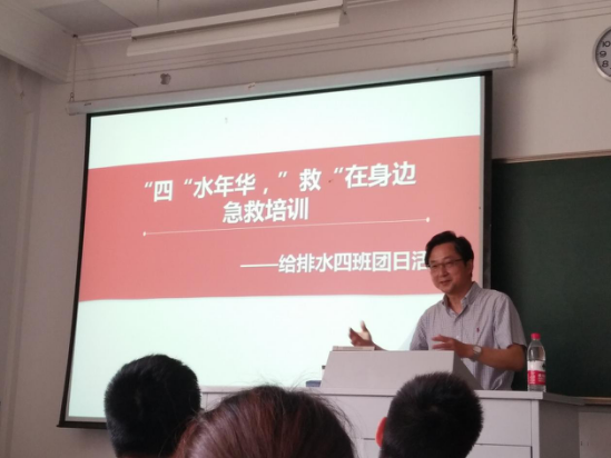 为更好的培育和践行社会主义核心价值观,同时积极响应2017年江苏省卫生计生委重点工作目标要求,提升大学生应急素养和急救互救能力,培养出更多具备较高综合素质的青年志愿者,2014级给排水四班团支部于2017年6月2日开展了以“四”水年华,“救”在身边为主题的团日活动。为此,特地邀请了国产视频 校医院副院长马红兵前来详细讲解各项急救知识,同时还邀请前国产视频 红十字会成员陈立豪进行实际操作演练。