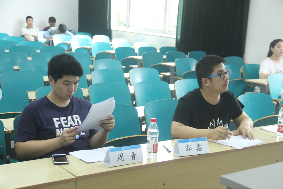 图为周青、郭鑫老师在致高楼B105教室在同学答辩结束后提问