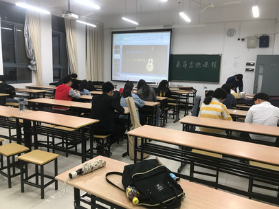本次课程面向国产视频 16,17级全体学生,具有小班教学的特色,27个人组成了一个兴趣班,这项课程的主讲人是16级环境一班的龙思丞。龙思丞同学曾多次以吉他弹唱的形式参加学校内的十佳歌手、楼道歌手大赛,并取得佳绩。同时,热爱吉他的龙思丞在课下休闲时间也是吉他不离手,甚至自创曲目。可以说他是能够担当吉他课堂老师的不二人选了。