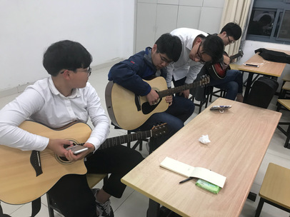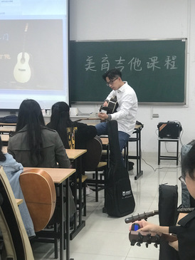 由于许多同学可能是第一次接触吉他,老师便从吉他的分类开始讲起,为了让一些新手能够买到适合自己的吉他,老师还特意介绍了吉他的品牌和一些选购吉他的小知识。同学们都在聚精会神地听着。接下来,老师开始介绍吉他的弹奏和指法,并给同学们做起示范,教室里响起一阵阵琴弦拨动的声音,同学们开始尝试弹奏,期间,老师又一个个地为同学纠正指法,防止同学们在学习中出错。