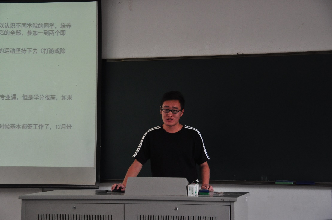 闫石磊学长主要着眼在安全问题上。通过几个实例,学长强调了新生需要有一定的警惕心,要学会向老师、学校寻求帮助。期间,学长还耐心回答了几个同学的疑问,幽默风趣的语言引得场内笑声连连。