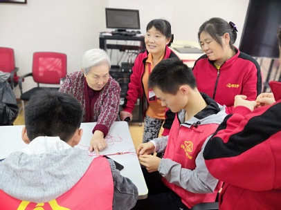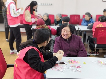 刚开始编手链时大家还有些生疏,但在与老人一起观看视频,共同分析步骤后,大家逐步把握了技巧。随着时间的推移,大家编织的手链也越来越好,编织的速度也越来越快。编好后,志愿者们纷纷为老人佩戴上亲手编织的手链。看到老人们开心的笑脸,大家都不禁感到此次活动十分有意义。