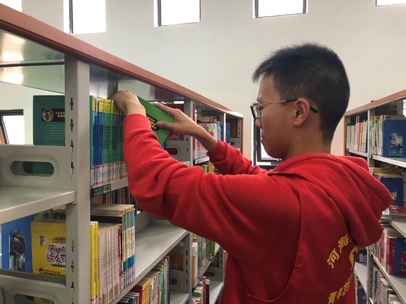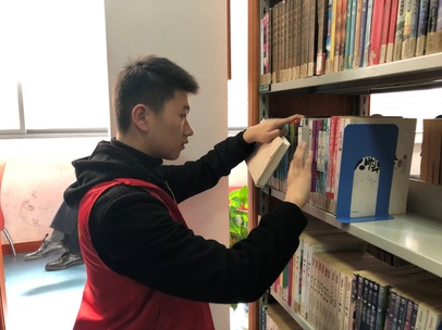 儿童区是整理图书工作最为繁忙的区域。志愿者们在摆放图书的同时还要协助小朋友借阅图书。由于小朋友们大多不懂得还书规则,志愿者们整理的工作量就大大增加了。成套的书籍常常杂乱地摆放在一起,需要志愿者们一本本抽出,再重新排序。即使已经工作了许久,志愿者们也没有懈怠,穿梭在书架与读者之间。他们像一阵暖风,经过之地的图书都整齐地排放,使得读者们的借阅也更加轻松快捷。