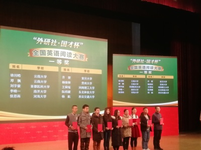 2018年12月9日,我院2015级环境科学专业本科生侯思雨同学在全国英语阅读大赛中喜获一等奖。 此项大赛由外语教学与研究出版社,教育部高等学校大学外语教学指导委员会等组织联合举办,历时3个月,由网络赛、学校落地赛、省内复赛和全国决赛组成。侯思雨同学于学校落地赛中脱颖而出,以校级特等奖晋级省赛,又力压省内其他高校选手以江苏省第一名的成绩顺利晋级全国决赛,最终在全国赛中取得一等奖的好成绩。