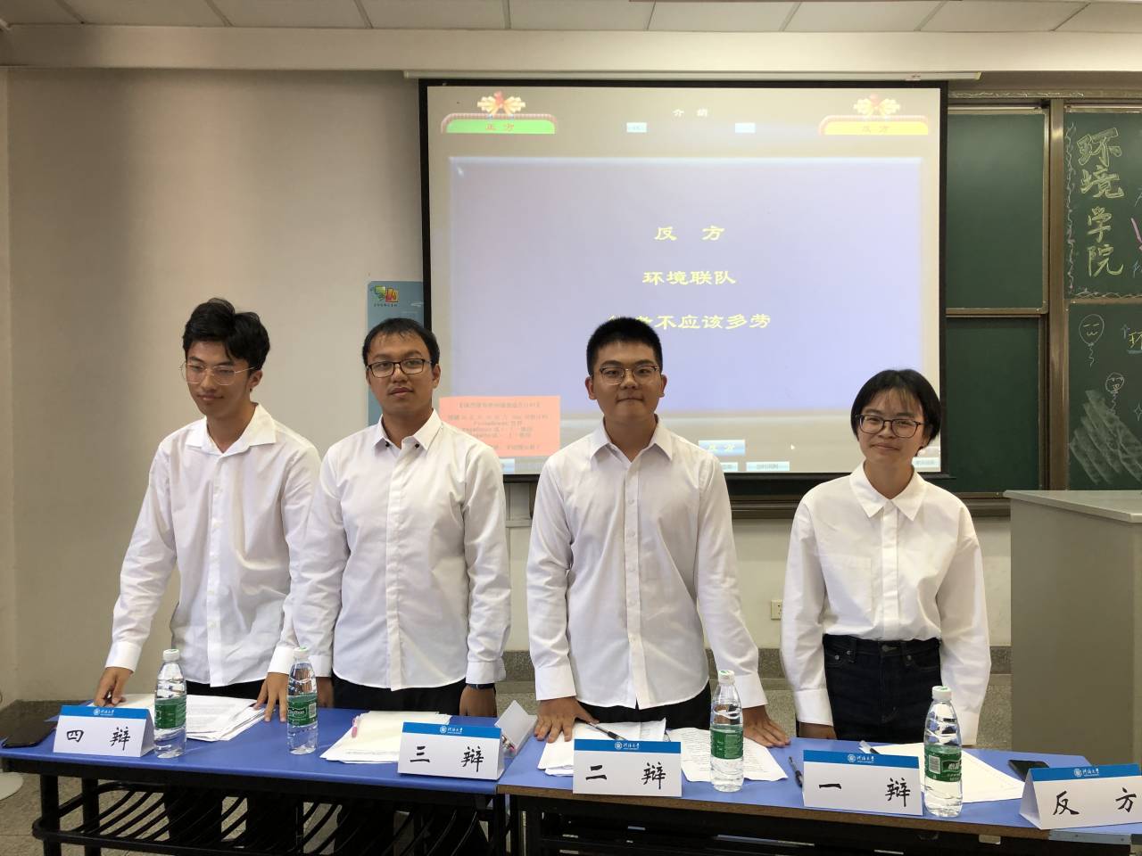 在主席的主持下,辩论赛正式开始。辩论赛第一场是正方环科生态联队与反方环境联队的唇枪舌剑。他们围绕“能者应不应该多劳”展开了激烈的辩论。正方认为,能者应该多劳,在某一领域能力相对较强的人,应在他所能承受的能力范围内应承担更多的责任。反方认能者只需做好本职工作,承担自己应尽的责任,而不需承担更多责任。双方围绕多劳与过劳的区别以及谁应该多劳展开了精彩的辩论,双方辩手你来我往,才思敏捷,又不乏风趣的比喻与例证。最终,经过一个小时的激烈比拼,评委们离席讨论,何杨副队长分别给正反双方做出点评,正方以3:2的比分获得了比赛的胜利。反方四辩凭借其优异的个人表现获得了本场比赛最佳辩手的称号,正方二辩凭借从容不迫的谈吐,获得最具风度辩手的称号。
