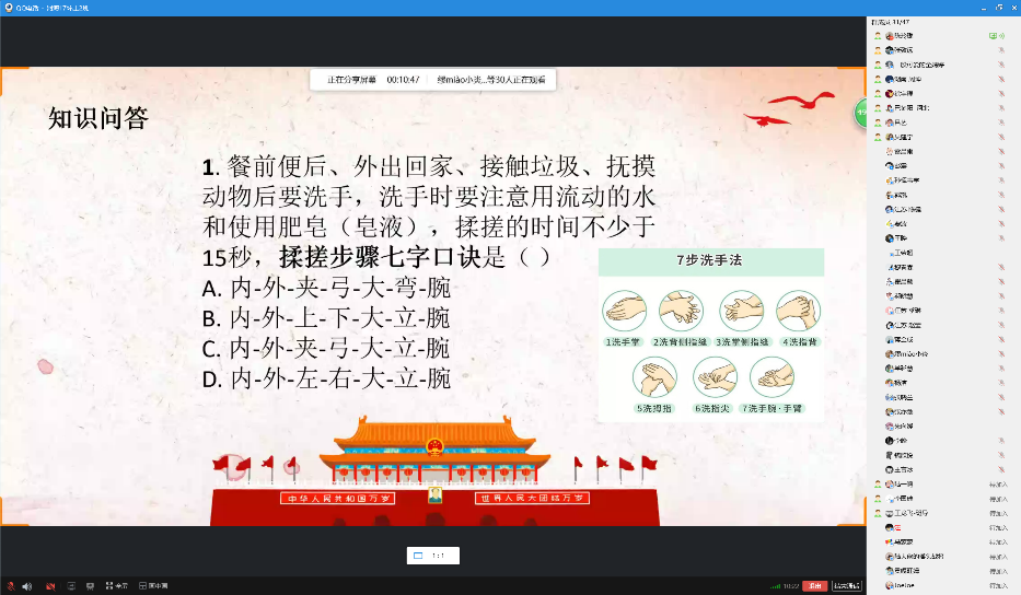 5月15日下午3时,由团支书陈玲珑主持线上班会。班会分为理论学习成果分享、主题宣讲、知识问答、战疫宣传四个部分。