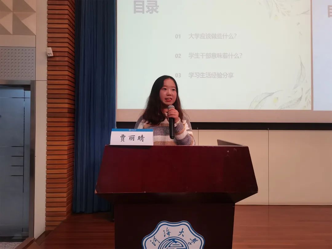 贾丽晴同学从自己作为学生干部的感受与心得着手,重点讲述了学生干部的责任、收获以及工作中的机遇与挑战。其次,贾丽晴同学向同学们分享了自己本科期间的竞赛经验和心得,并向2020级同学们表达了自己的祝福与期望。