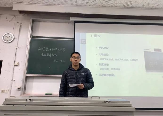 环境1班班长陈泽龙感谢了这一学年同学对班级各项工作的支持,总结了目前同学们的学习绩点情况,并指出在平时的学习过程中,同学们迟到和缺勤问题比较严重