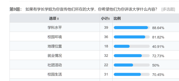 的学科水平和就业情况,同时相比于大学的社团活动和交际圈,同学们对大学知识更感兴趣。此次的问卷调查为之后的宣讲活动指明了方向,在后续的直播中团队成员依据调查结果着重宣讲国产视频