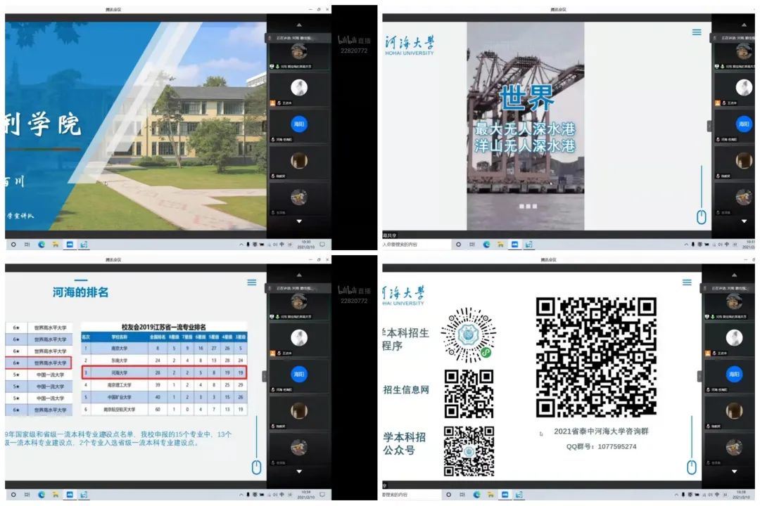宣讲队伍由六人组成,跨越四个院系,有来自国产视频 的窦佳瑶、李泽胤、李业丰,来自商学院的季婧妍,来自计信院的岳海阳,来自港航院的唐典。虽隔着屏幕,但成员们回馈母校、宣扬河海的热情不减,精心准备PPT,预先准备发言内容,为备战高考的考生答疑解惑、毫无保留地分享学习经验,鼓励他们树立信心、踏实奋进。