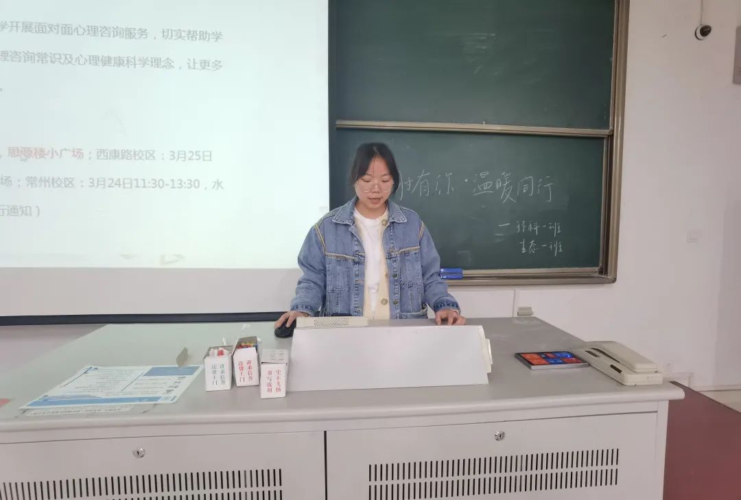 首先,倪天祎同学简单介绍了开展本次主题心理班会的背景及其意义。以便及时关心了解同学们的心理状态,提供解决问题的多种途径。