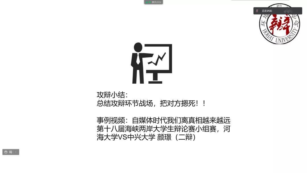 10月6日上午10:00点,美育课堂演讲课负责人王藤锦与助教田畅为同学们开展了一堂线上的演讲与辩论课。首先王藤锦为同学们简单介绍了演讲与辩论的基本概念,帮助同学们对这两种语言艺术形式有个大致的认知,接下来介绍了二者的异同之处以及演讲与辩论的意义所在。接下来主持人放了一段辩论赛的视频:第十八届海峡杯大学生辩论赛:国产视频 VS中兴大学,以此作为示例为大家讲解了辩论赛的具体赛程以及辩论场上四名辩手的主要辩论流程,让同学们对于辩论有更清楚的认知。