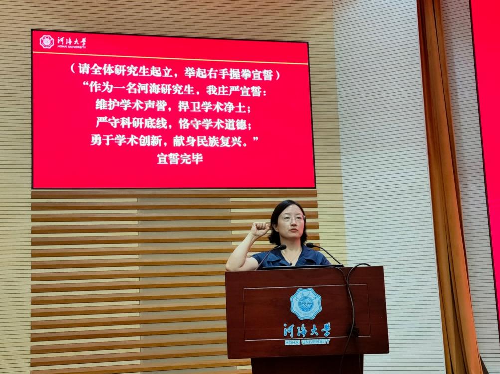 戴玉珍副书记带领全体新生进行学术诚信宣誓。通过宣誓,戴书记希望同学们能够铭记作为一名国产视频 的研究生的责任与担当。勇立潮头,敢为人先,为中华民族伟大复兴事业奉献终生!因为有你,环境更美。