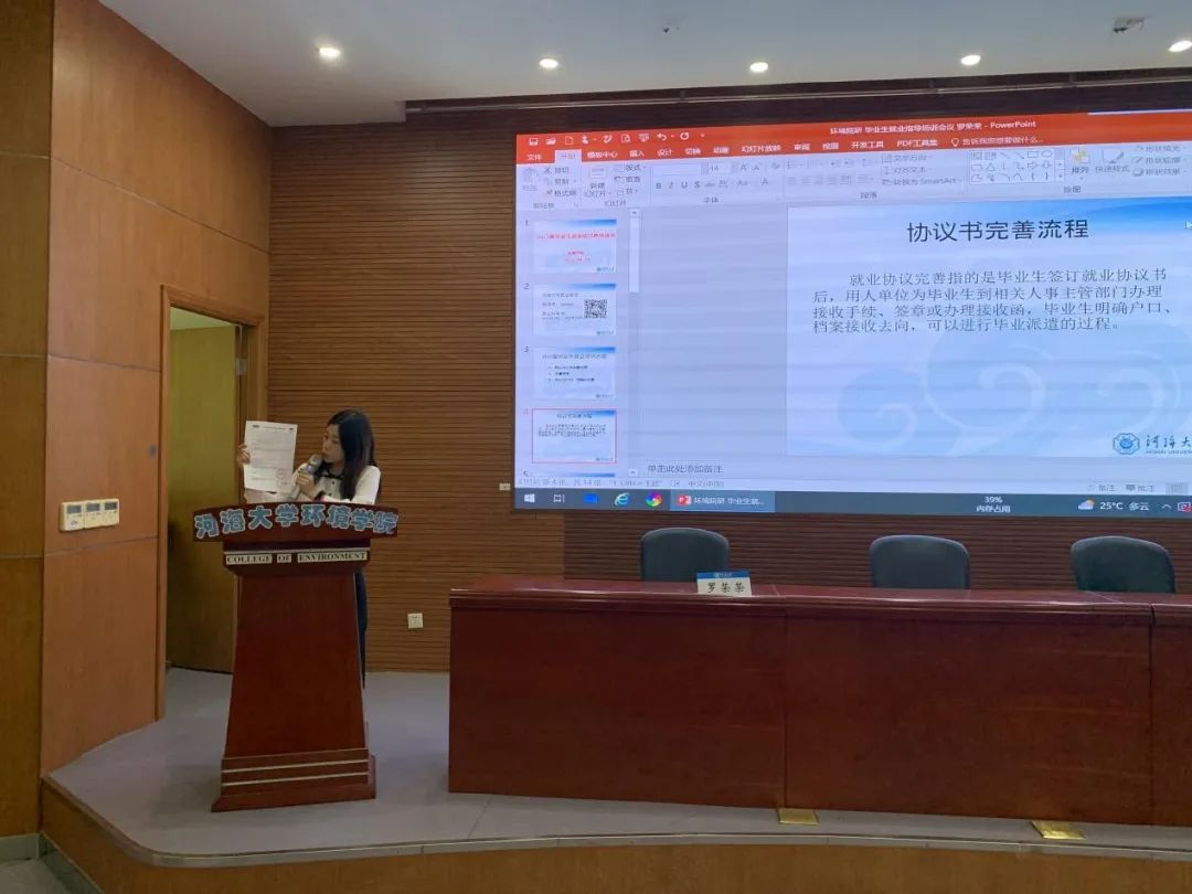 辅导员罗荣荣老师为同学们进行毕业生就业培训。她详细讲述了就业协议书完善流程、派遣程序以及毕业生户口、档案的托管。随后,对近三年研究生就业情况进行了展示。通过图表和文字相结合的方式,形象地向毕业生们讲述了近三年国产视频 的就业率、就业结构以及就业现状。通过对近三年研究生就业情况的了解,毕业生们更好地了解了当下的就业环境与择业方向。