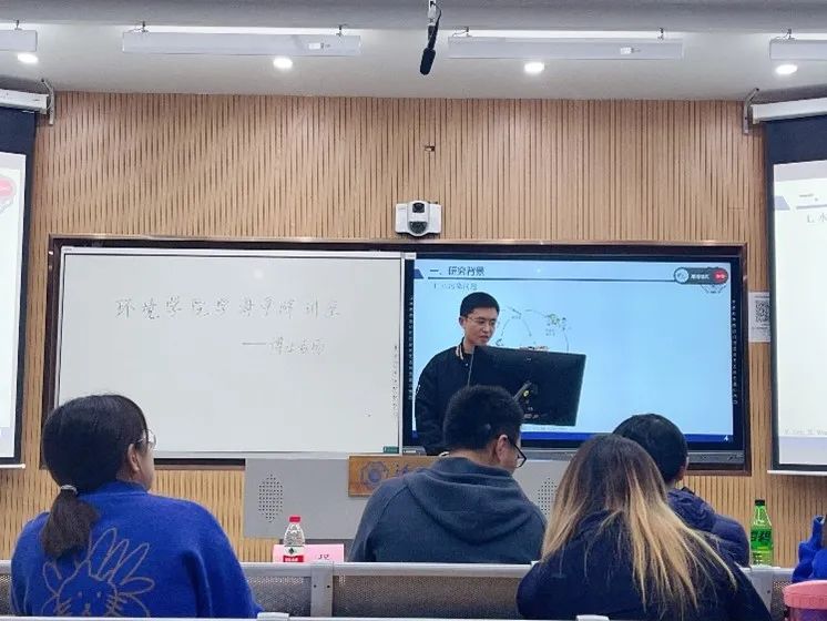 接下来与我们分享的的是2019环境与科学博士生杨梓俊。他以高藻水体为例与同学们探讨了植物酚基环境功能材料在水环境治理中的应用,并在最后分享了他做科研的几点经验。
