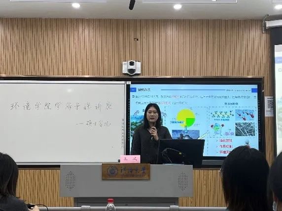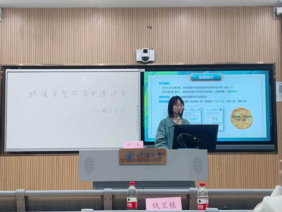 其次与大家进行交流的是20级市政工程专业硕士生杜韦,杜韦先对自己研究课 “对氯间二甲苯酚对厌氧发酵过程的影响及作用机制” 做了分享,其次又与同学们分享了她的科研之路及学术经验。就如何高效实验、如何与老师沟通等问题分享了她的经验。