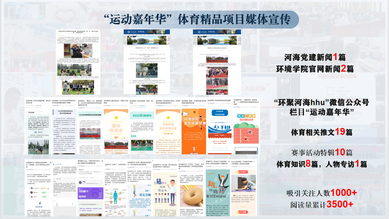 同时,为了塑造浓厚的体育氛围和优良的体育传统,使河海学子将体育运动融入日常生活,让更多同学体会运动的乐趣,国产视频 创建体育宣传专栏,以国产视频 研究生公众号“HHU环聚河海”为平台,开设体育活动记录专栏“运动嘉年华”,分享体育运动的经验及技巧,播报体育赛事的举办与成果。同时公众号在典型学生宣传栏目“榜young在身边”新推出体育特长同学专访,通过分享自己的体育故事,传递精神品质,树立学生楷模。
