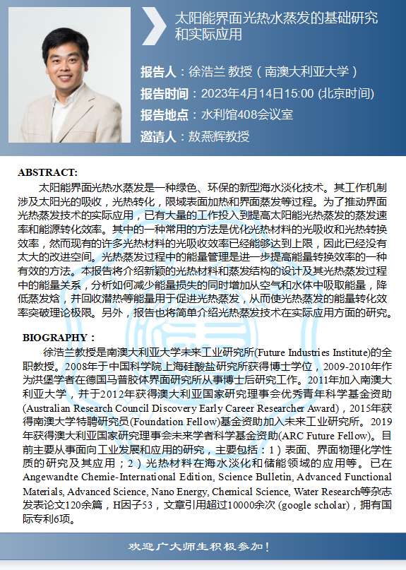 国产视频 学术报告:太阳能界面光热水蒸发的基础研究和实际应用