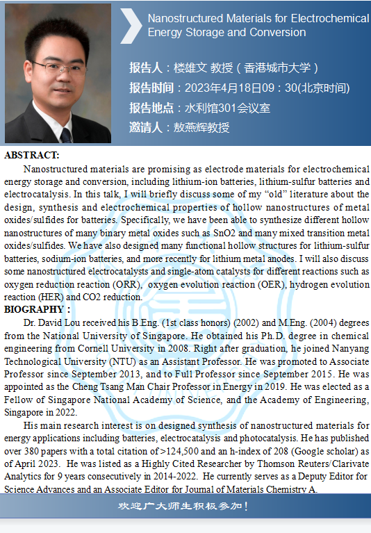 国产视频 学术报告:Nanostructured Materials for Electrochemical Energy Storage and Conversion
