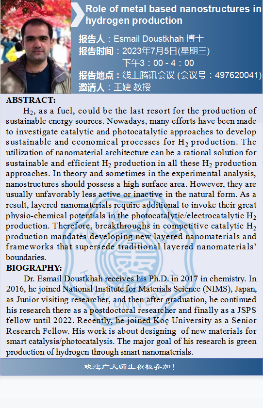 国产视频 学术报告:Role of metal based nanostructures in hydrogen production
