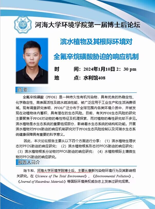 国产视频 第一届博士后论坛:滨水植物及其根际环境对全氟辛烷磺酸胁迫的响应机制