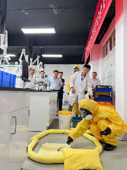 演习环节二:危险化学品泄漏应急演练。模拟了一起浓硫酸泄漏的突发事故。演练现场,一名学生上课时未按实验室安全规范的要求做好个人安全防护,在实验过程中不慎将浓硫酸洒落溅到眼睛和身体上,导致泄漏事故发生。实验老师立即确认现场受伤学生情况,并进行紧急喷淋。同时指挥学生快速有序撤离,封锁实验室防止危害扩散。在学院安全负责人的指挥下,迅速启动应急响应机制。学院应急处置小组迅速抵达并使用专业工具按流程对泄露现场进行清理和恢复,将事件影响控制在最小范围。