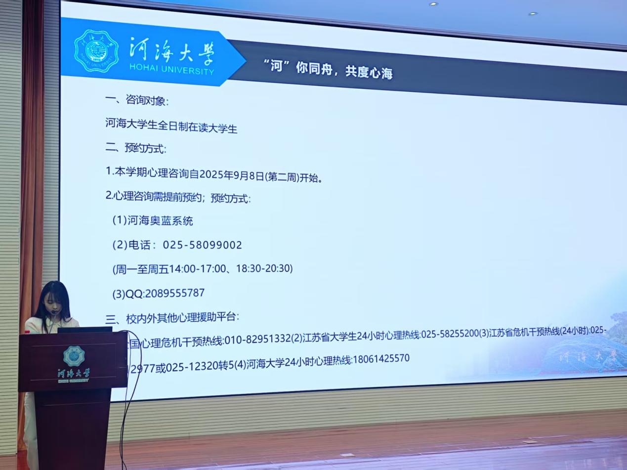 最后,郭老师向新生们介绍了学校心理健康教育与咨询服务体系,公布了心理咨询预约方式和校内外心理援助热线。她鼓励同学们树立积极健康的心态,学会在学习和生活中寻求支持,做到“河你同舟,共度心海”,让心理关怀成为守护青春的重要力量。
